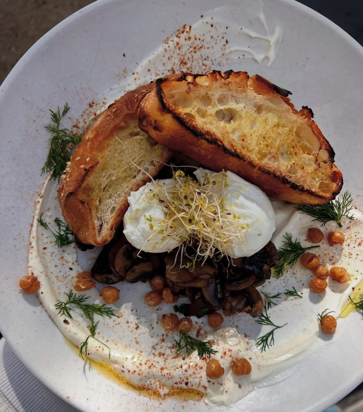 Poached eggs, lemon herbs labneh, roasted mushrooms, spice & Turkish bread, dill, chilli oil